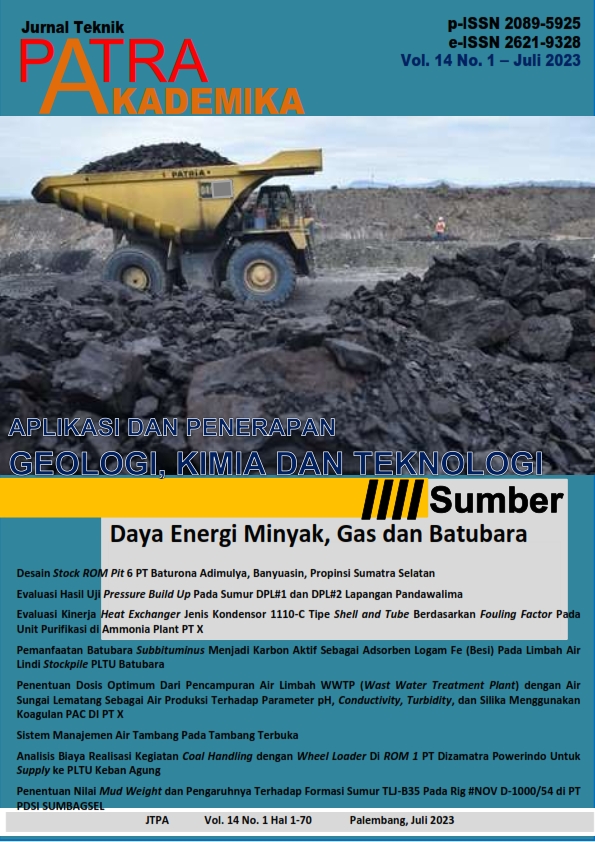 Penerbitan Jurnal Patra Akademika edisi kali ini menampilkan 8 tulisan dari hasil penelitian dosen internal dan eksternal, ke-8 tulisan ini berupa: Desain Stock ROM Pit 6 PT Baturona Adimulya, Banyuasin, Propinsi Sumatra Selatan; Evaluasi Hasil Uji Pressure Build Up Pada Sumur DPL#1 dan DPL#2 Lapangan Pandawalima; Evaluasi Kinerja Heat Exchanger Jenis Kondensor 1110-C Tipe Shell and Tube Berdasarkan Fouling Factor Pada Unit Purifikasi di Ammonia Plant PT X; Pemanfaatan Batubara Subbituminus Menjadi Karbon Aktif Sebagai Adsorben Logam Fe (Besi) Pada Limbah Air Lindi Stockpile PLTU Batubara; Penentuan Dosis Optimum Dari Pencampuran Air Limbah WWTP (Wast Water Treatment Plant) dengan Air Sungai Lematang Sebagai Air Produksi Terhadap Parameter pH, Conductivity, Turbidity, dan Silika Menggunakan Koagulan PAC DI PT X; Sistem Manajemen Air Tambang Pada Tambang Terbuka; Analisis Biaya Realisasi Kegiatan Coal Handling dengan Wheel Loader Di ROM 1 PT Dizamatra Powerindo Untuk Supply ke PLTU Keban Agung; dan Penentuan Nilai Mud Weight dan Pengaruhnya Terhadap Formasi Sumur TLJ-B35 Pada Rig #NOV D-1000/54 di PT PDSI SUMBAGSEL.