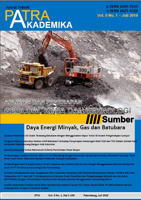 Penerbitan Jurnal Patra Akademika edisi kali ini menampilkan 8 tulisan dari hasil penelitian dosen internal dan eksternal, ke-8 tulisan ini berupa: Analisis Penetralan Air Asam Tambang Batubara dengan Menggunakan Kapur Tohor Di Kolam Pengendapan Lumpur, Pengaruh Massa Adsorben Karbon Aktif Batubara Terhadap Penyerapan Kandungan Nilai COD dan TOC Dalam Limbah Kain Jumputan Pada Rancang Bangun Alat Adsorber; Blending Batubara Untuk Memenuhi Kriteria Permintaan Pasar Ekspor, Perbandingan Kualitas Pelumas Motor 4T Di Palembang Dengan Parameter Uji Specific Gravity, Kinematic Viscosity, Flash Point, Pour Point, Total Acid Number (TAN) dan Vacuum Distillation; Perbandingan Hasil Produksi Sumur FA #17 Sebelum dan Setelah Well Service dengan Menggunakan Metode Bailing Out Sand Di PT Pertamina Hulu Energi Siak Field Batang; Estimasi Ketidakpastian Dari Pengukuran Nilai Viskositas Kinematik (VK) Pelumas Berdasarkan Standar ASTM D 445 Pada Temperatur 40 °C dan 100 °C Di Laboratorium Pelumas Pusat Penelitian dan Pengembangan Minyak dan Gas Bumi (PPPTMGB) Lemigas; Pemanfaatan Biodiesel Dari Minyak Jelantah Menggunakan Gelombang Mikro; dan Analisis Kebutuhan Pompa Untuk Mine Dewatering Kuartal Iii Sump Pit 1 Utara, Banko Barat, PT Satria Bahana Sarana Tanjung Enim, Propinsi Sumatera Selatan.